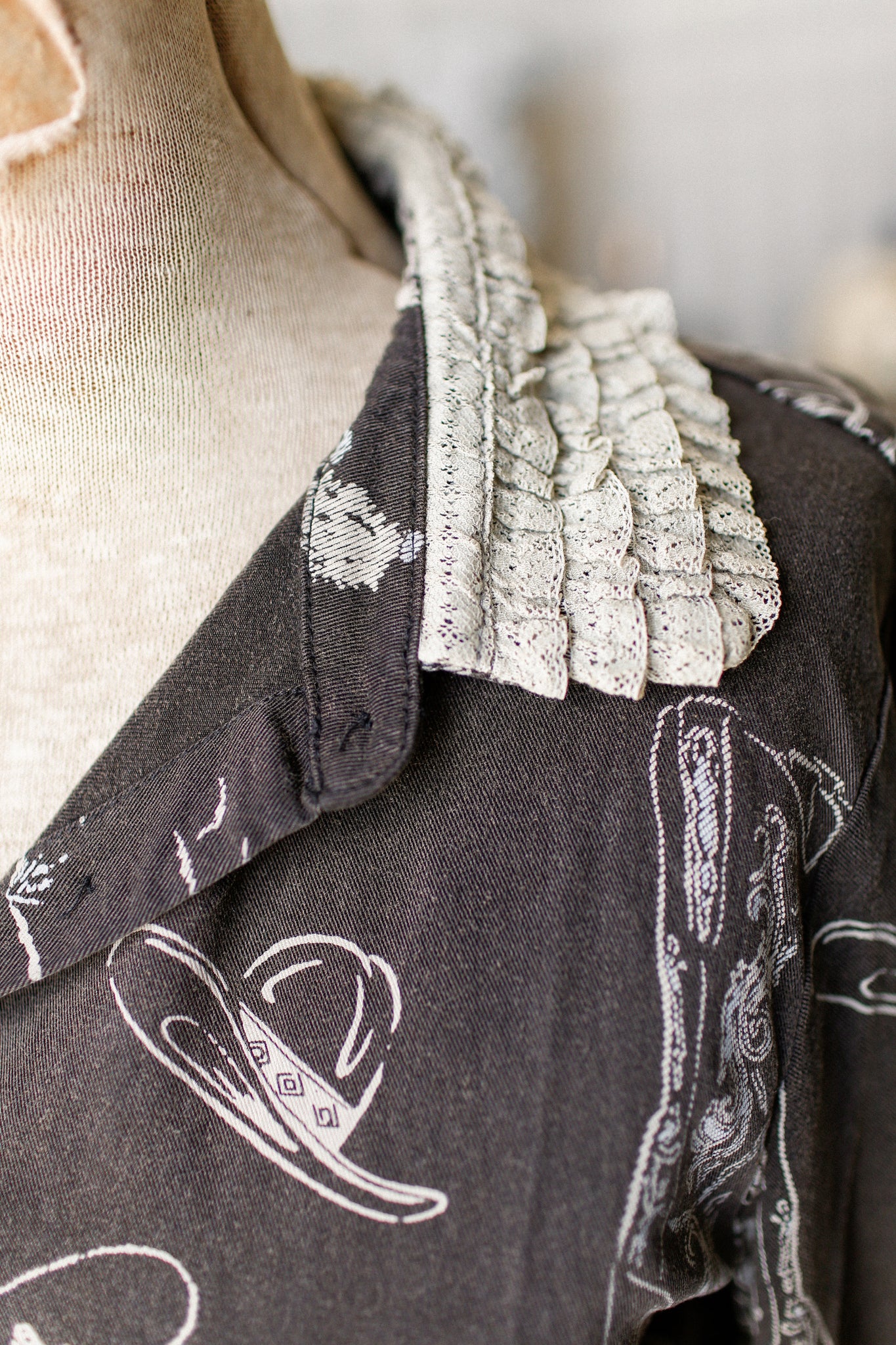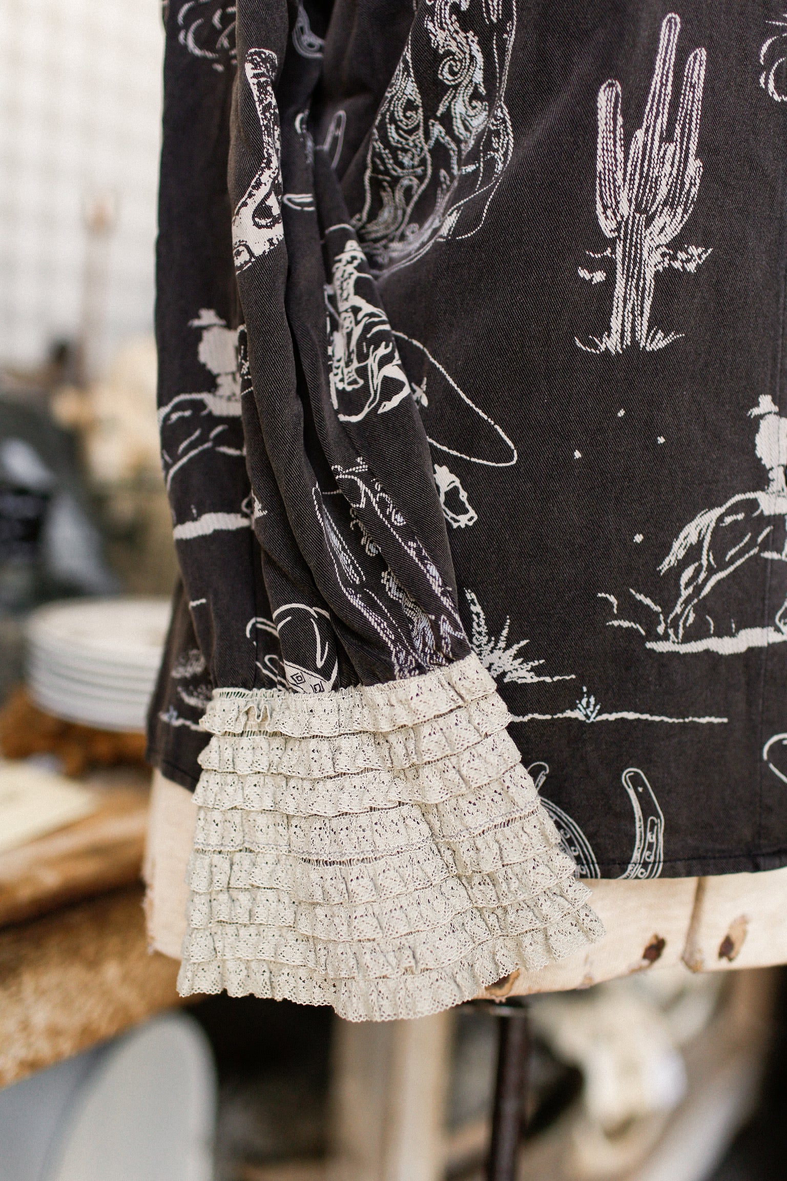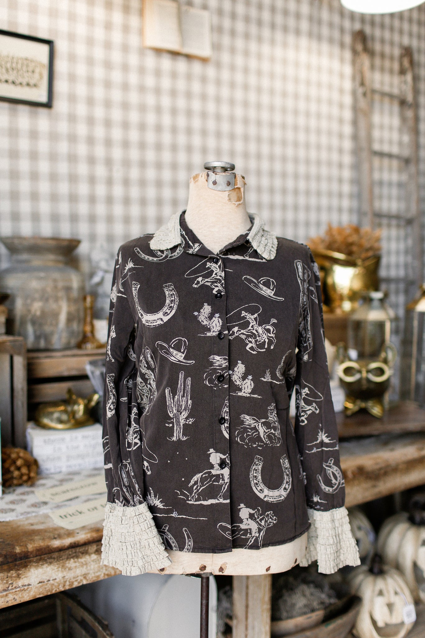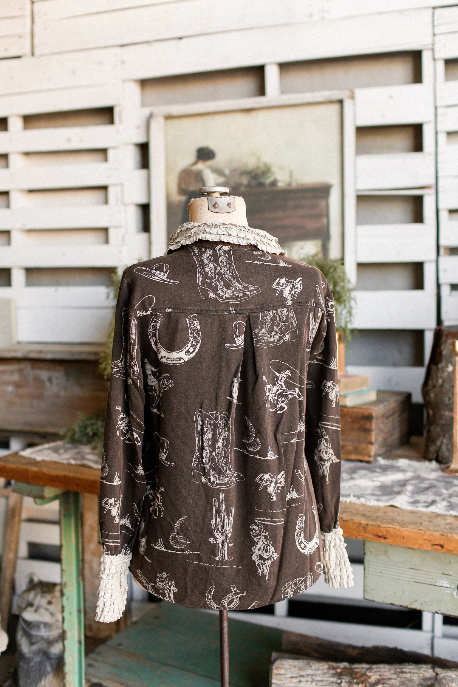 Add a pop of western charm to your wardrobe with this playful Western Button Down. Featuring a cream western print on a warm brown background, it’s finished with delicate cream lace on the collar and cuffs for a fun, flirty twist. Perfect for adding cowboy flair with a feminine touch!