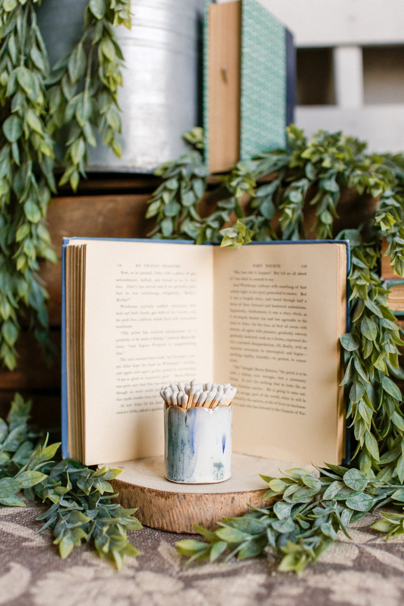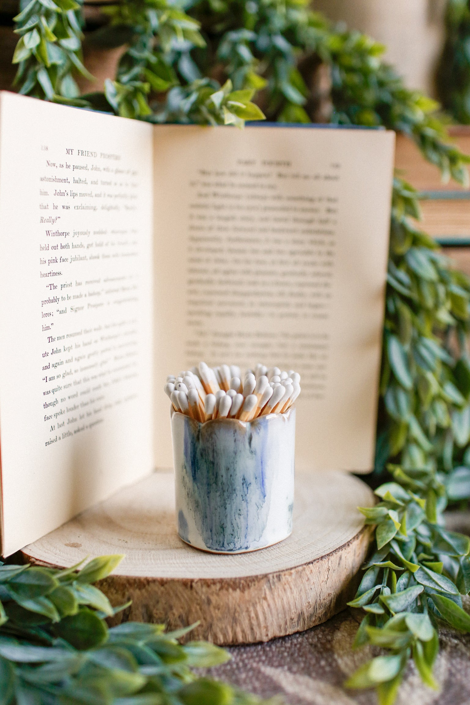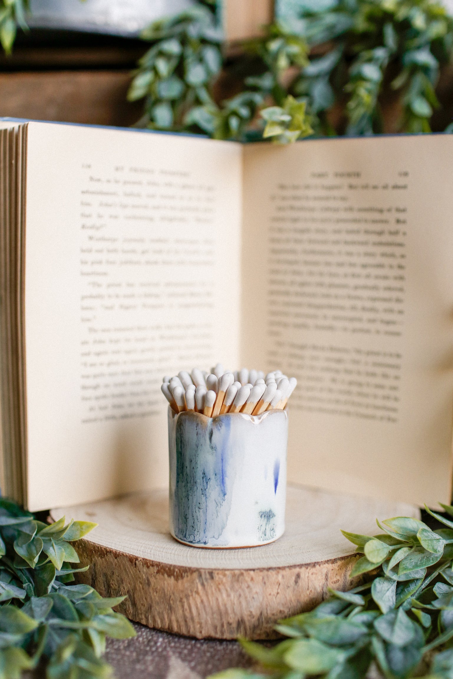 Keep your matches organized in style with this charming stoneware Watercolor Scalloped Trim Match Holder. Featuring a delightful scalloped trim design, it's both practical and pretty—holding 20-25 matches while adding a touch of elegance to your home. Striker on bottom.