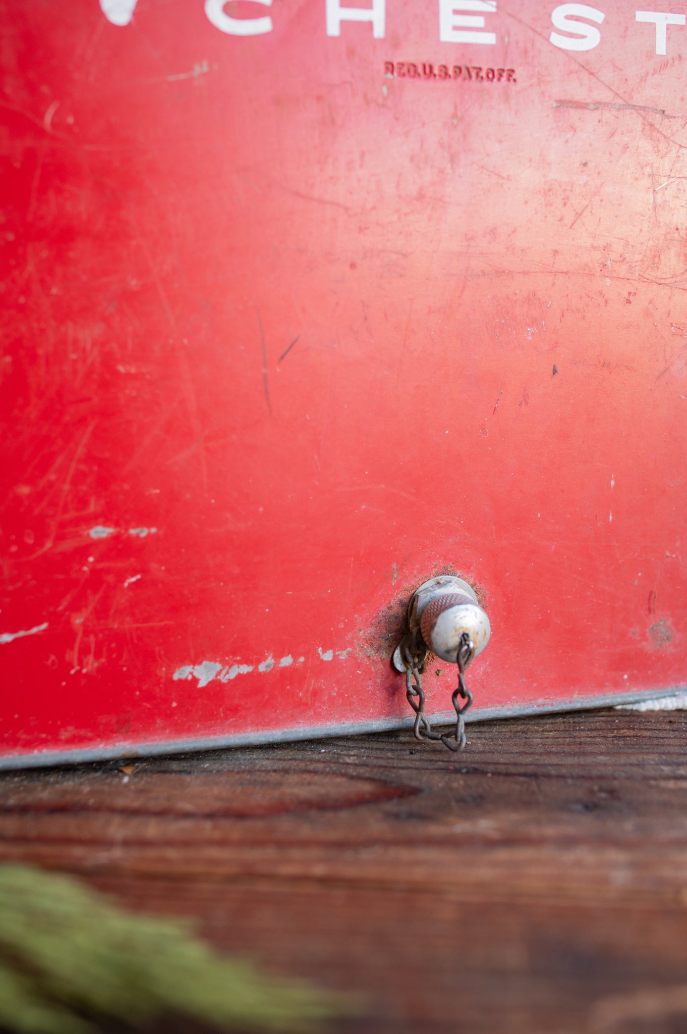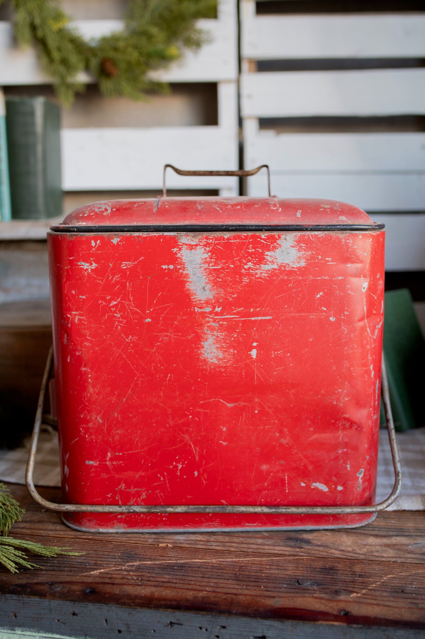 Enjoy this cheery 1950's Pleasure Chest solid metal cooler as a base for a tree or on its own. The lid is handled for easy removal and the front reads "Pleasure Chest" in white font. Add this vibrant red cooler to your Christmas decor for some vintage charm!