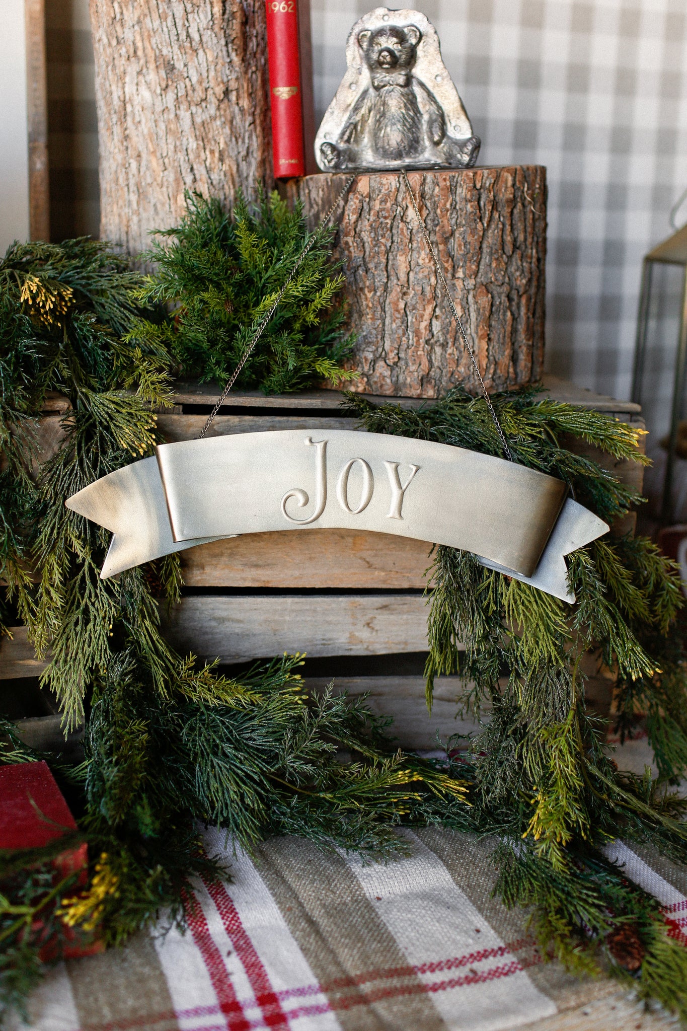 Aged brass metal sign with embossed style letters that read "Joy", has a metal chain attached making hanging or layering easy. We love seeing these styled in a Christmas Tree! Lightweight & thin metal.