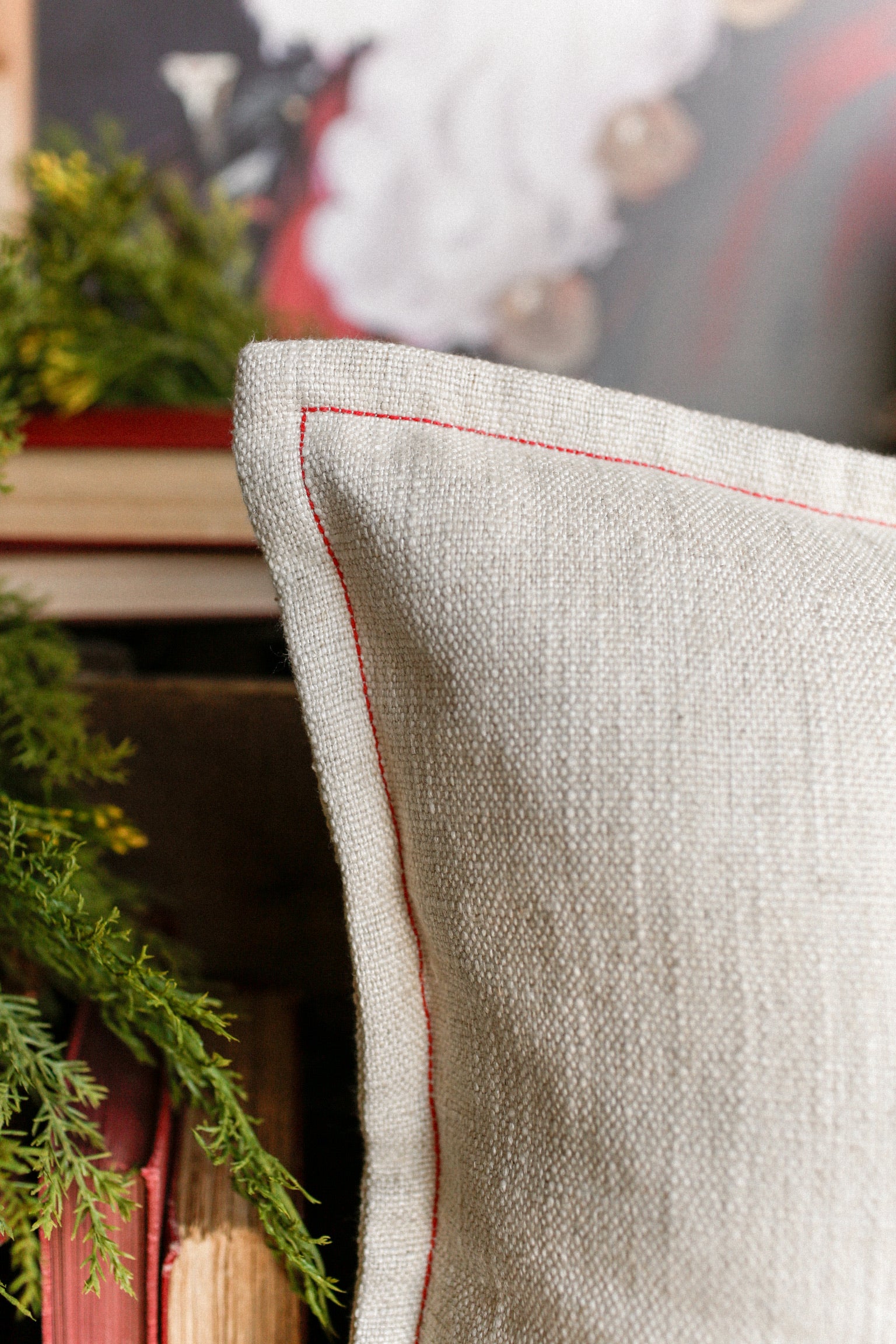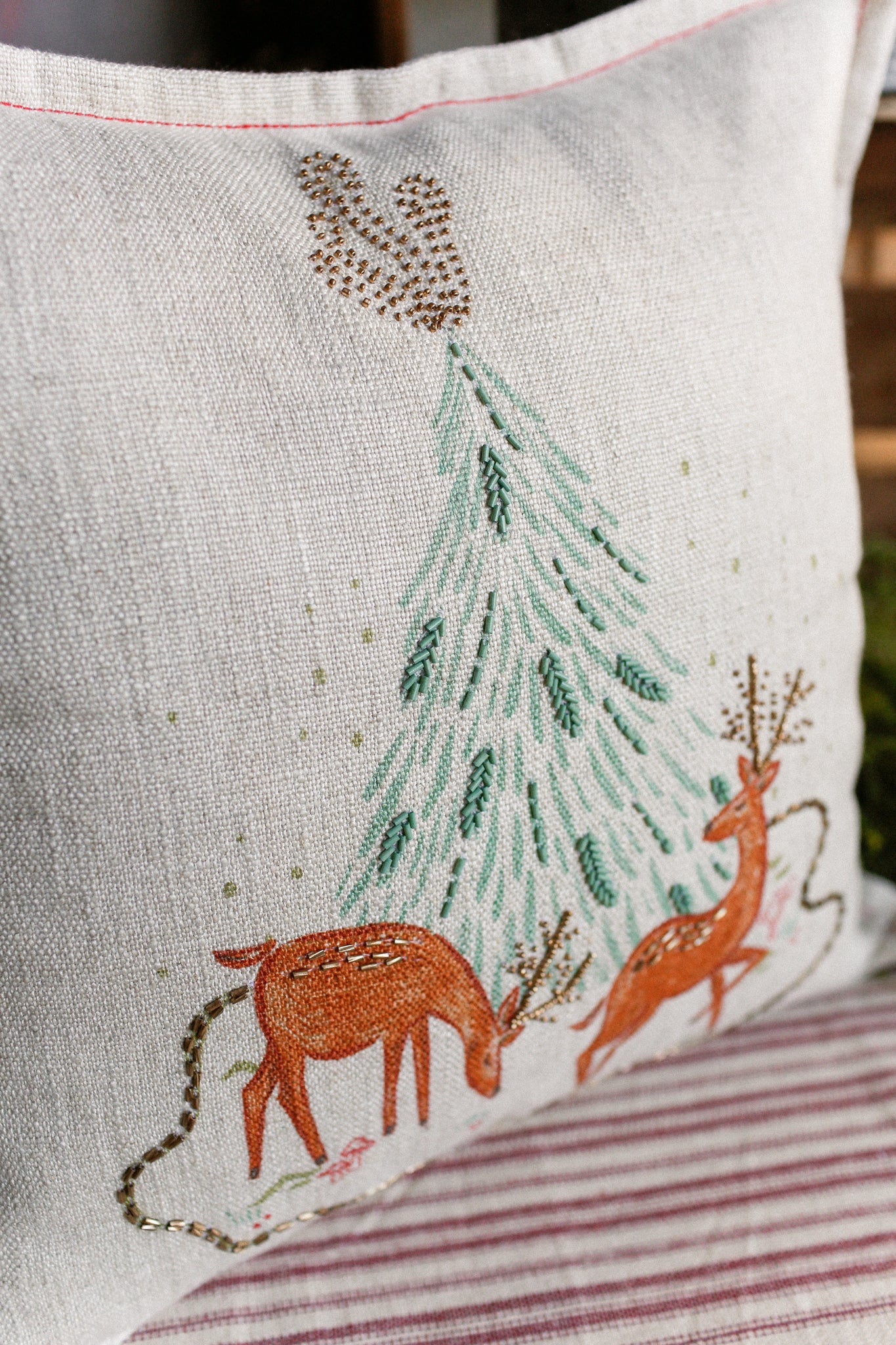 BACK THIS YEAR! Celebrate the season with this charming pillow showcasing a festive forest scene! Adorable embroidered deer prance around a twinkling Christmas tree, accented with delicate beadwork for extra sparkle. The soft cream background keeps things cozy and versatile, while a cheerful red stitched trim frames the whole merry design. Perfect for adding holiday cheer to any room!