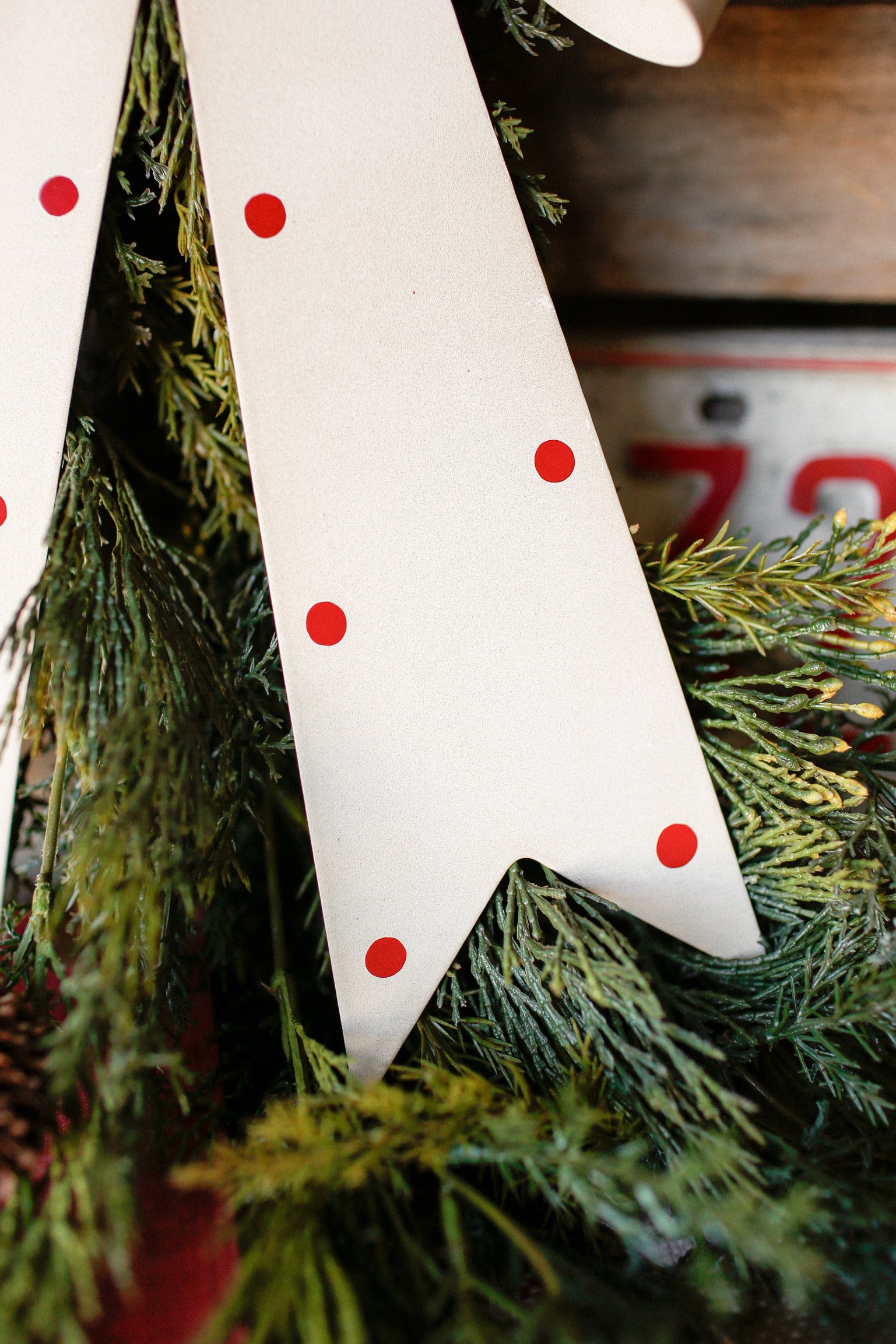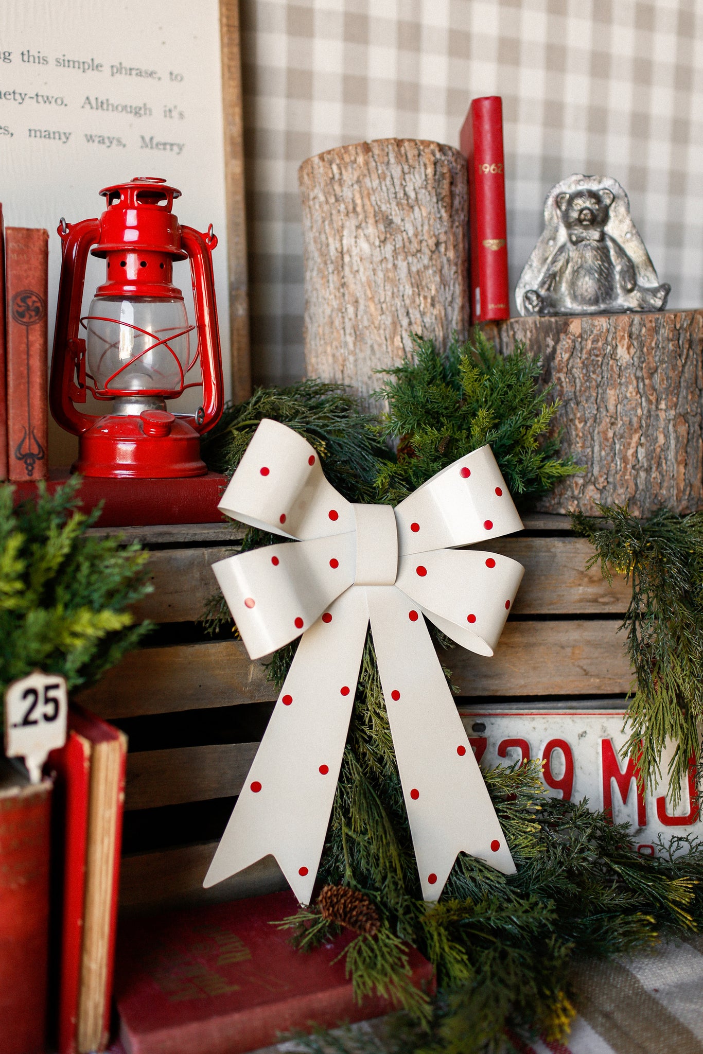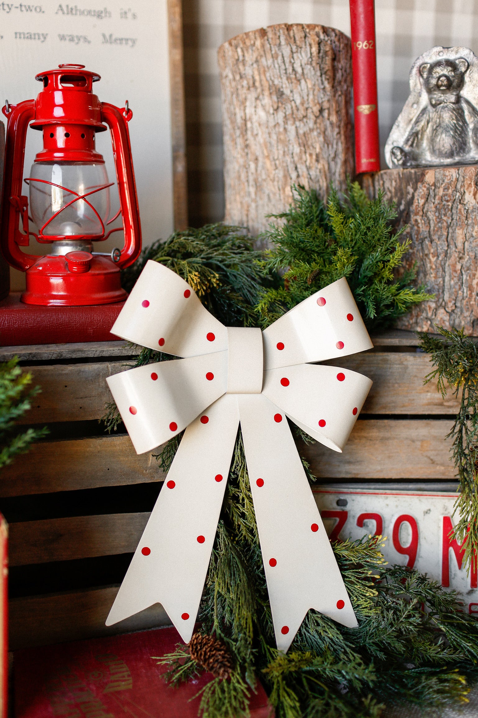 Bring festive cheer to your holiday décor with this Metal Cream Polka Dot Bow. Its creamy background dotted with bright red polka dots adds a playful and charming touch to any space. Equipped with hanging hardware on the back, it’s easy to display on walls, doors, or mantels, making your celebrations even more joyful and colorful.