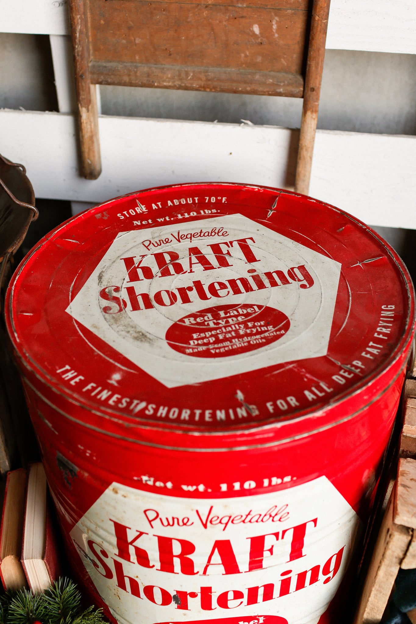 Vintage 110lb Pure Vegetable Kraft Shortening tin in the perfect festive cherry red color. Has original writing & 2 original metal handles. This is PERFECT for your Christmas tree, firewood or even to style under your tree.