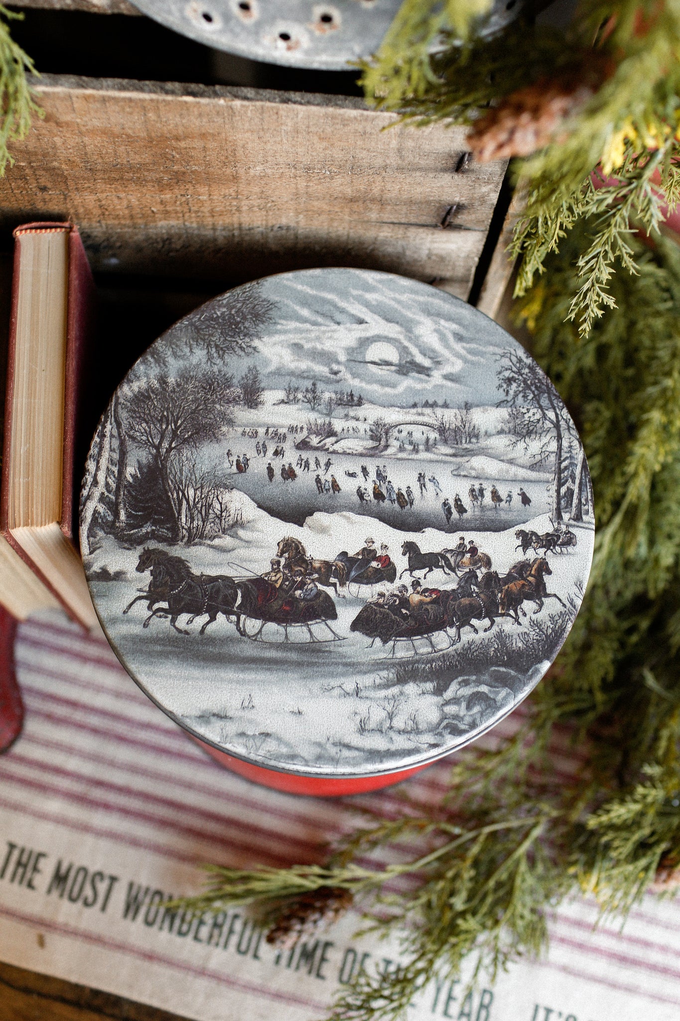 Bring a touch of holiday nostalgia to your home with this Vintage Currier and Ives Christmas Tin. Featuring a charming "Central Park in Winter" scene on the lid, this all-red bottom tin captures the magic of a snowy holiday season. Perfect for storing treats or adding festive flair to any room, it’s a delightful piece of vintage holiday decor that sparks warmth and joy.