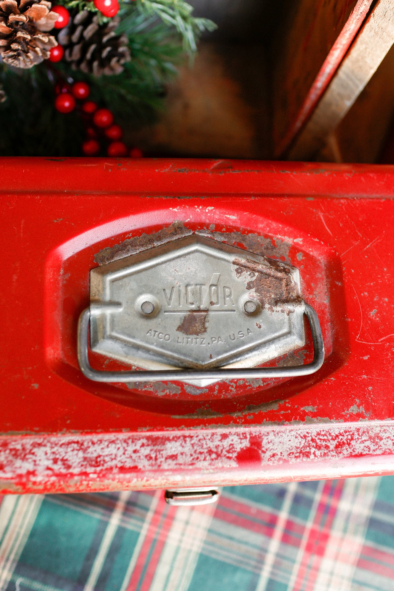 Add a splash of retro charm to your holiday decor with this Vintage Red Metal Toolbox. Crafted from sturdy metal with a bright red finish, it features a hinged lid topped by a distinctive silver handle engraved with "Victor Atco, Lititz PA. U.S.A." Whether nestled among holiday ornaments or displayed year-round, it brings a fun, vintage vibe to any space. Durable and eye-catching, this toolbox is a delightful find that celebrates classic American craftsmanship with a playful twist.