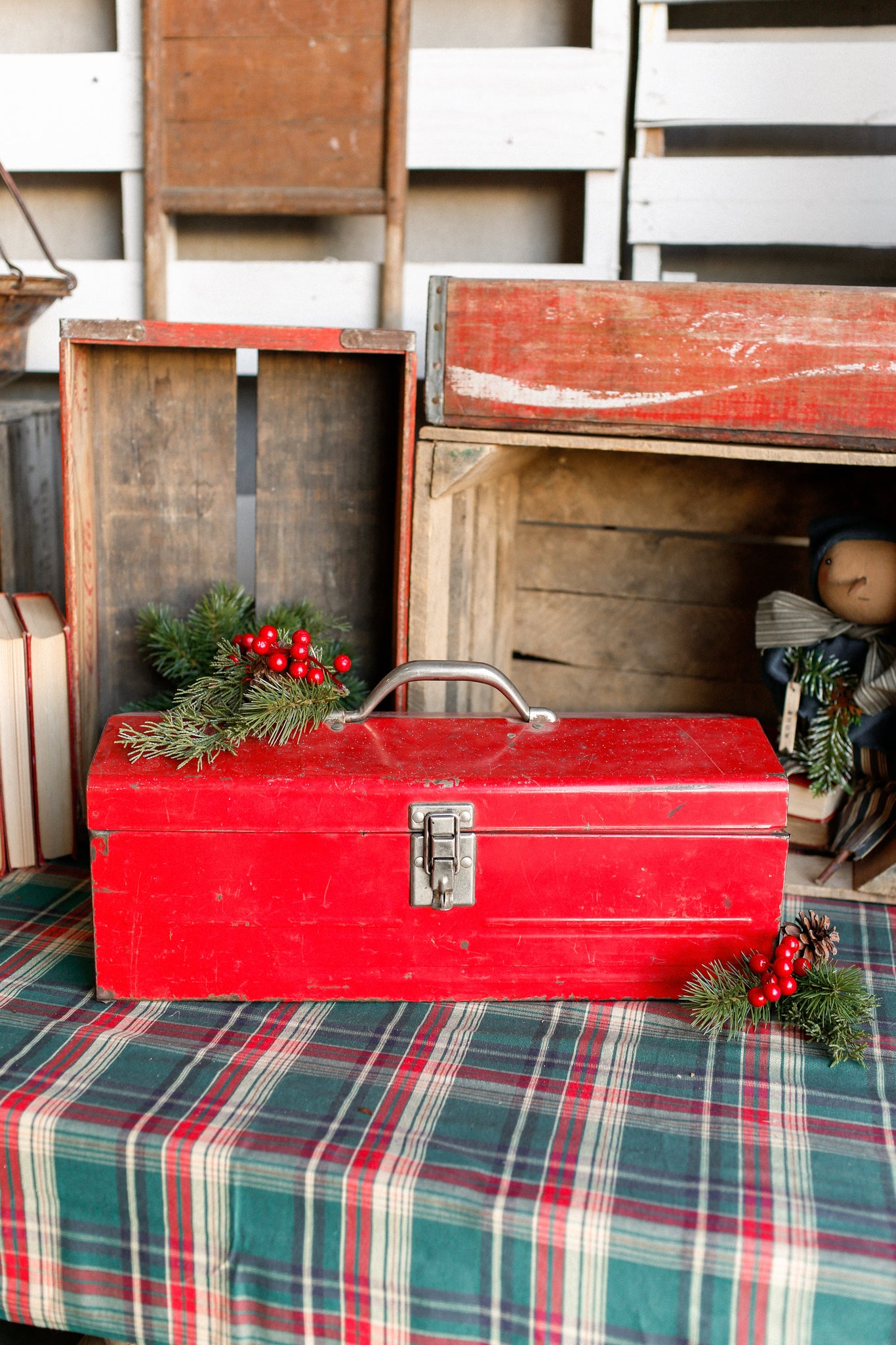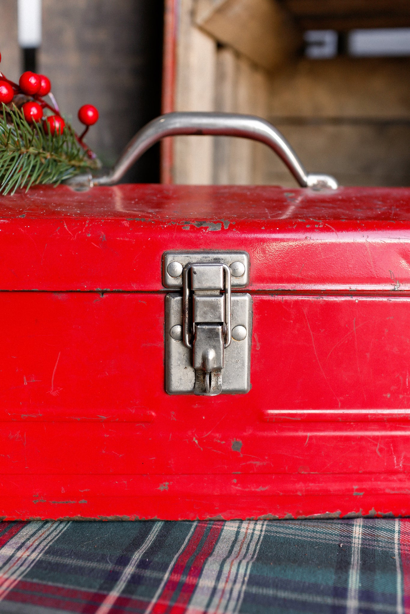 Bring festive charm to your holiday setup with this striking vintage red metal toolbox! Perfect for injecting personality and vibrant color into your seasonal decorating scheme, this charming piece doubles as both functional storage and eye-catching décor. A playful addition that transforms any space with nostalgic appeal and cheerful style.