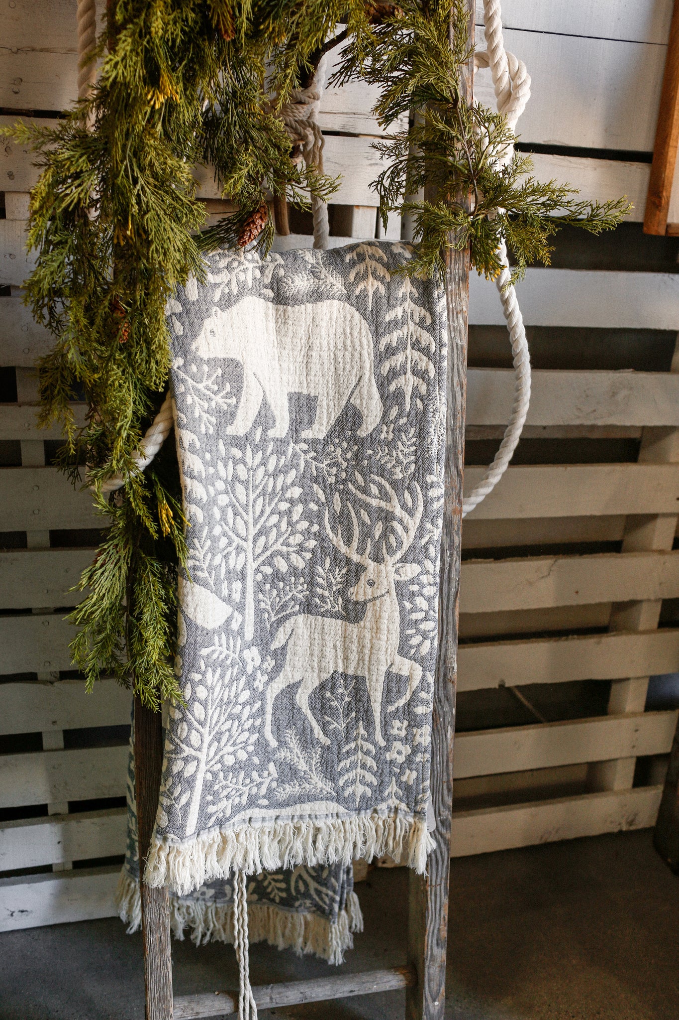 Elevate your space this winter with this cozy fringed woodland throw, proudly made in Portugal. Featuring your favorite woodland animals and greenery on a neutral blueish/gray background with fringe edges.