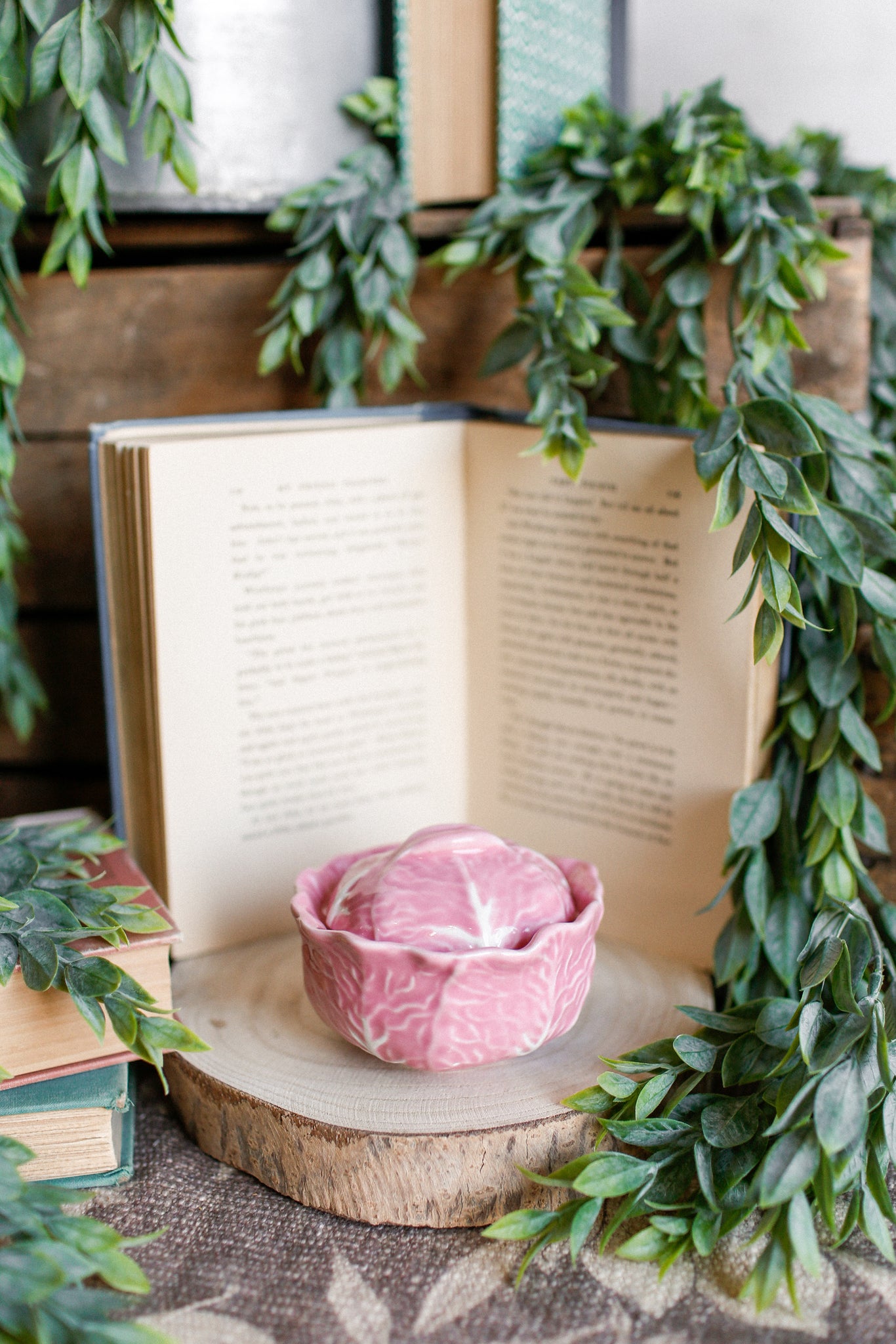 Elevate your dining experience with this exquisite hand-painted cabbage baker dish. The intricate detailing and vibrant pop of fresh pink will add a touch of elegance to any table setting. Great to hold your Easter candy or Spring treats too! Has a removable lid and holds about 6 oz.