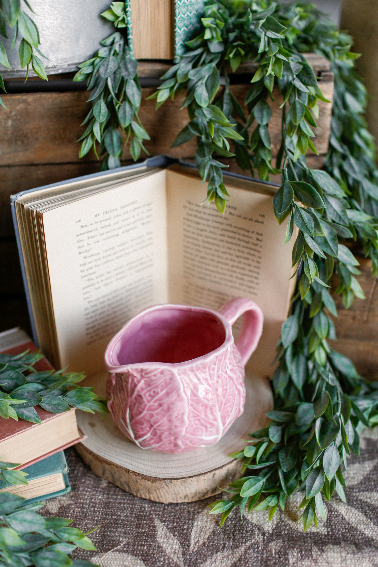 Elevate your dining experience with this exquisite hand-painted cabbage creamer. The intricate detailing and vibrant pop of fresh pink will add a touch of elegance to any table setting. Great to hold your Easter candy or Spring treats too!