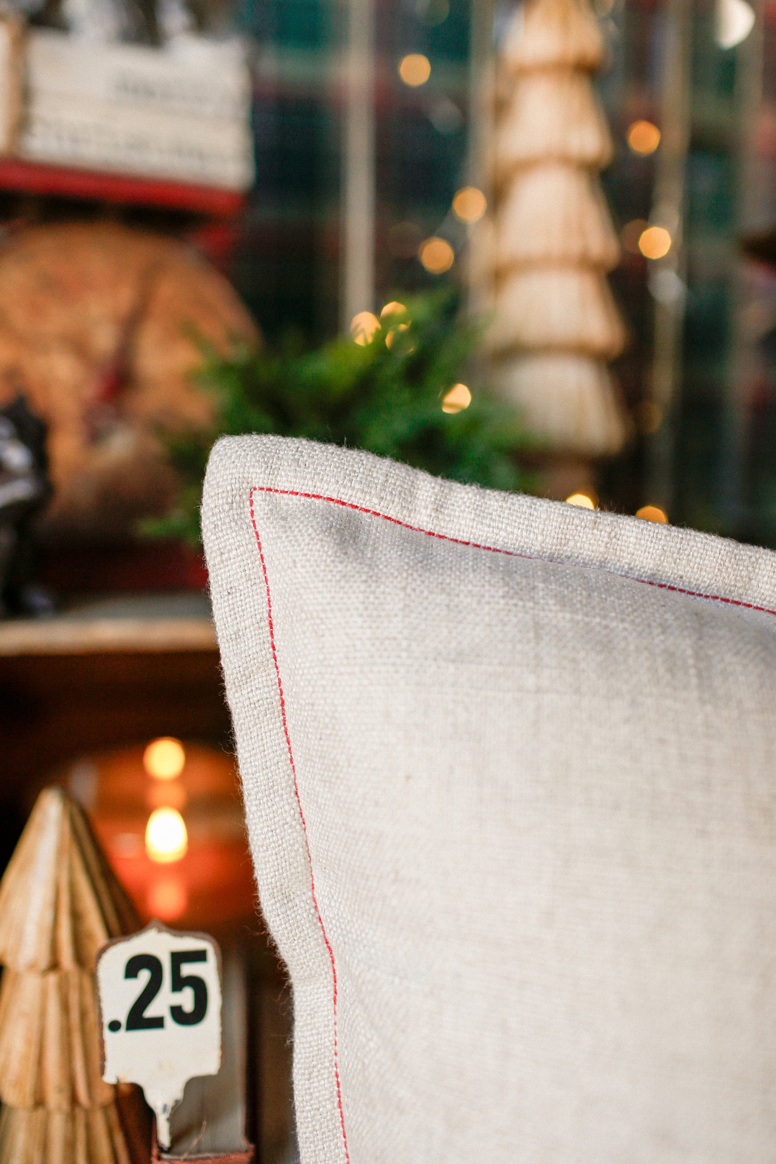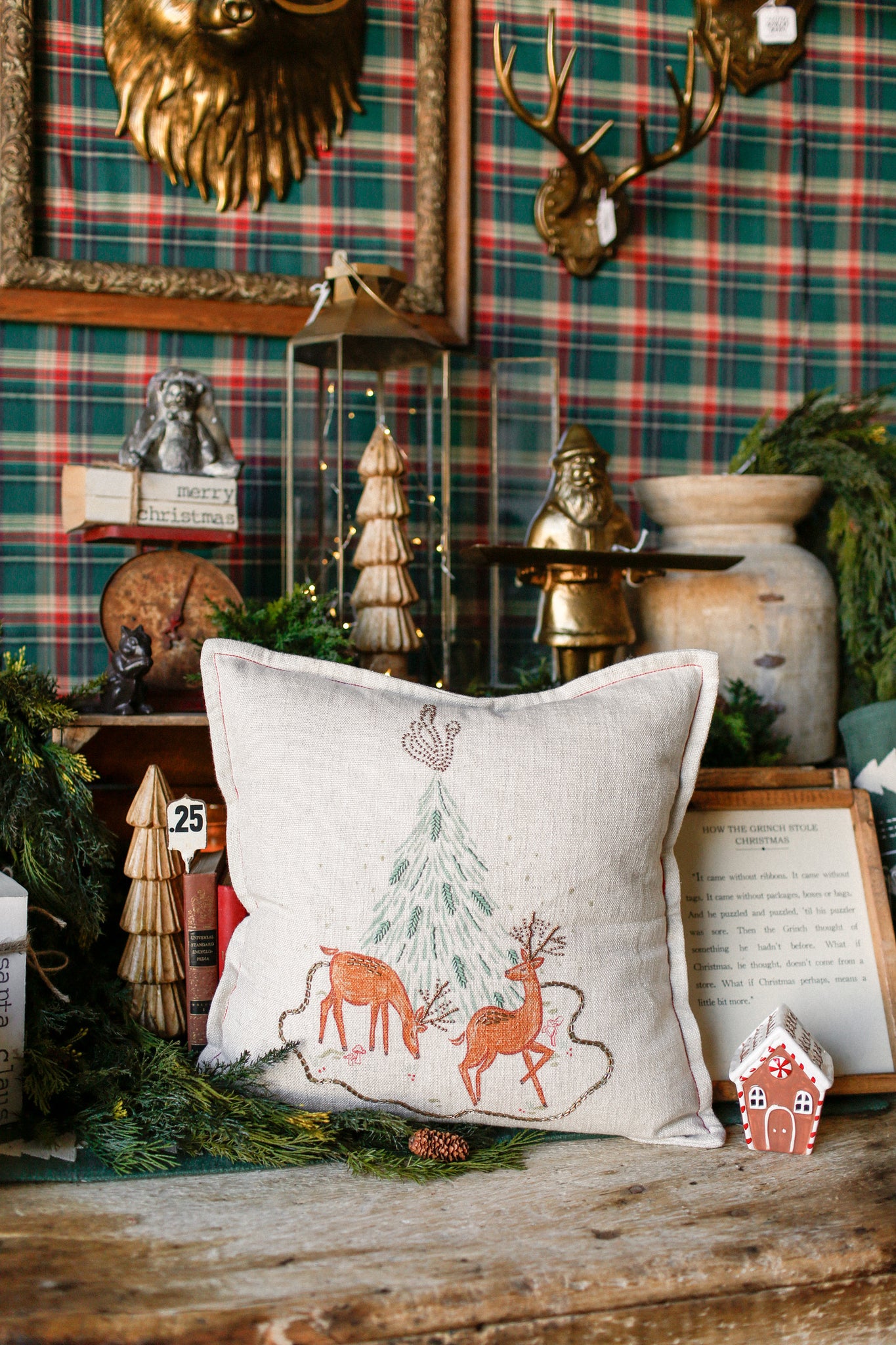 BACK THIS YEAR! Celebrate the season with this charming pillow showcasing a festive forest scene! Adorable embroidered deer prance around a twinkling Christmas tree, accented with delicate beadwork for extra sparkle. The soft cream background keeps things cozy and versatile, while a cheerful red stitched trim frames the whole merry design. Perfect for adding holiday cheer to any room!