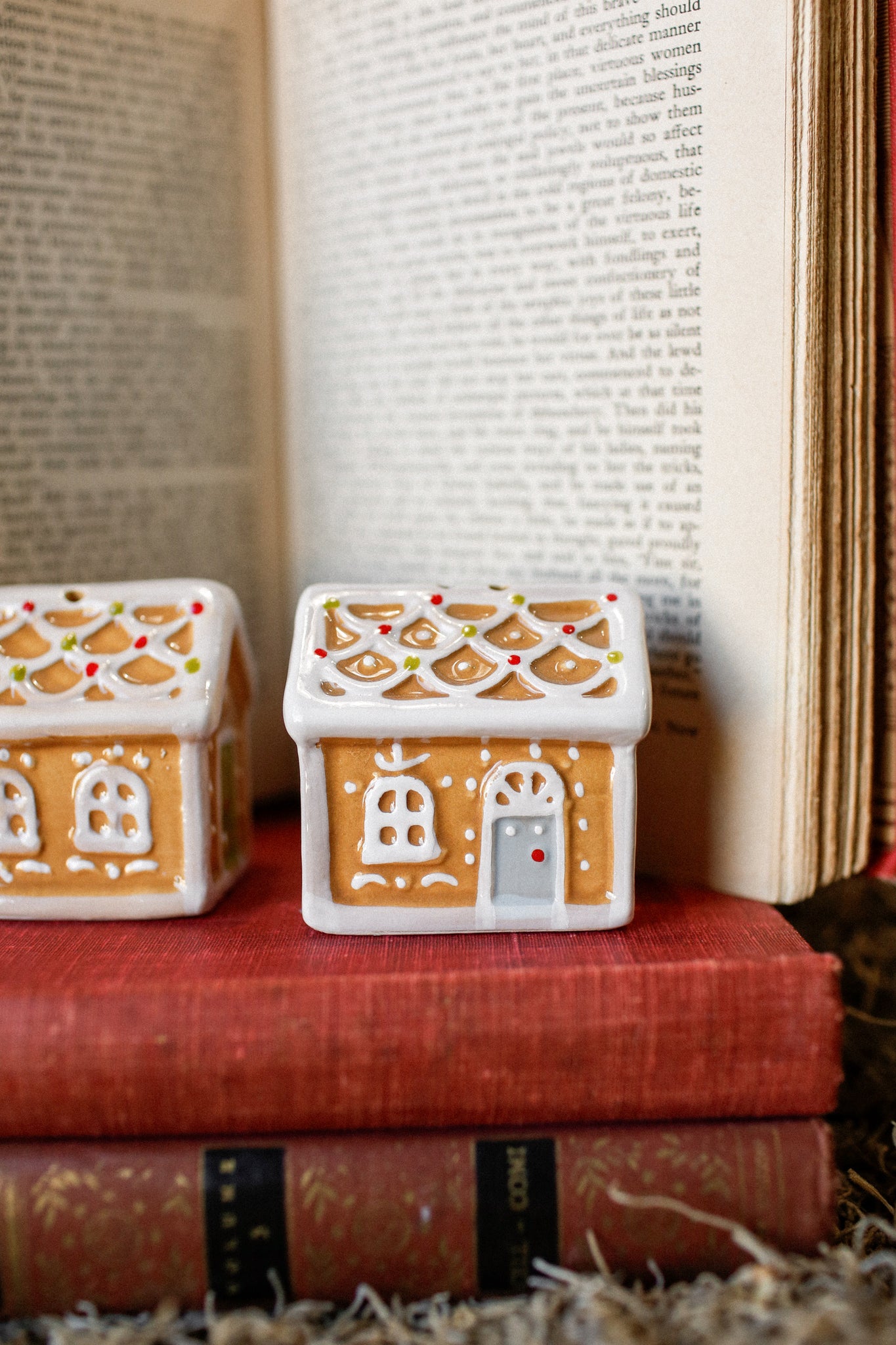 The cutest set of Gingerbread House Salt & Pepper Shakers, pepper featuring a blue door and salt featuring a green door. These are sure to bring some holiday cheer to your table this season.