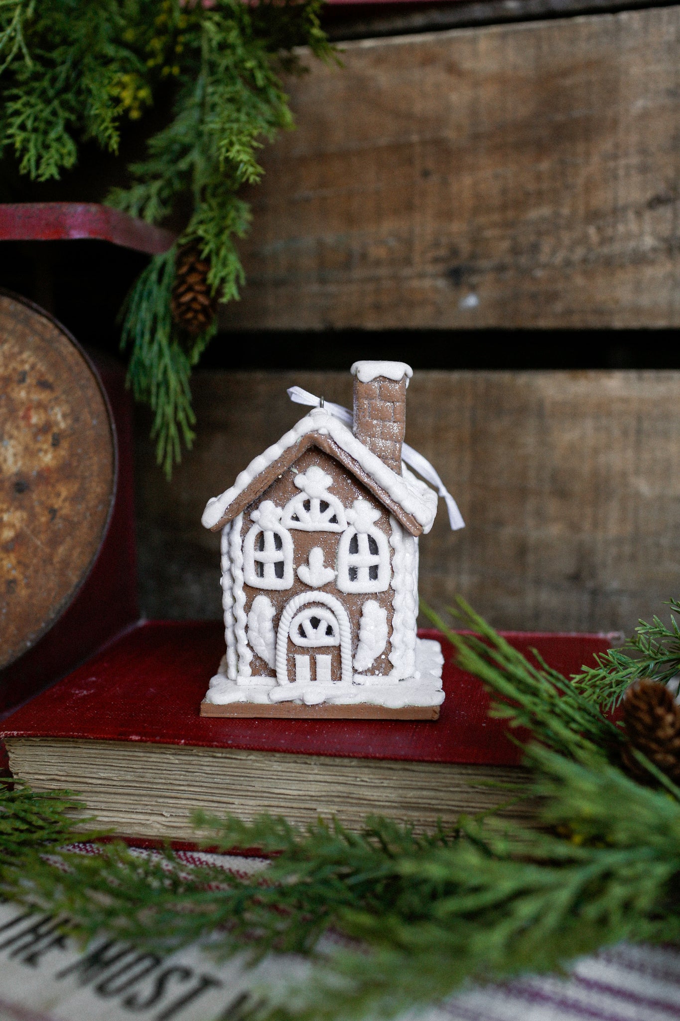 Believe it or not, these mini gingerbread houses aren't real! These gingerbread inspired ornaments look and feel real made with clay dough & piped frosting inspired accents and are a mini size. White ribbon attached for easy hanging on your tree.