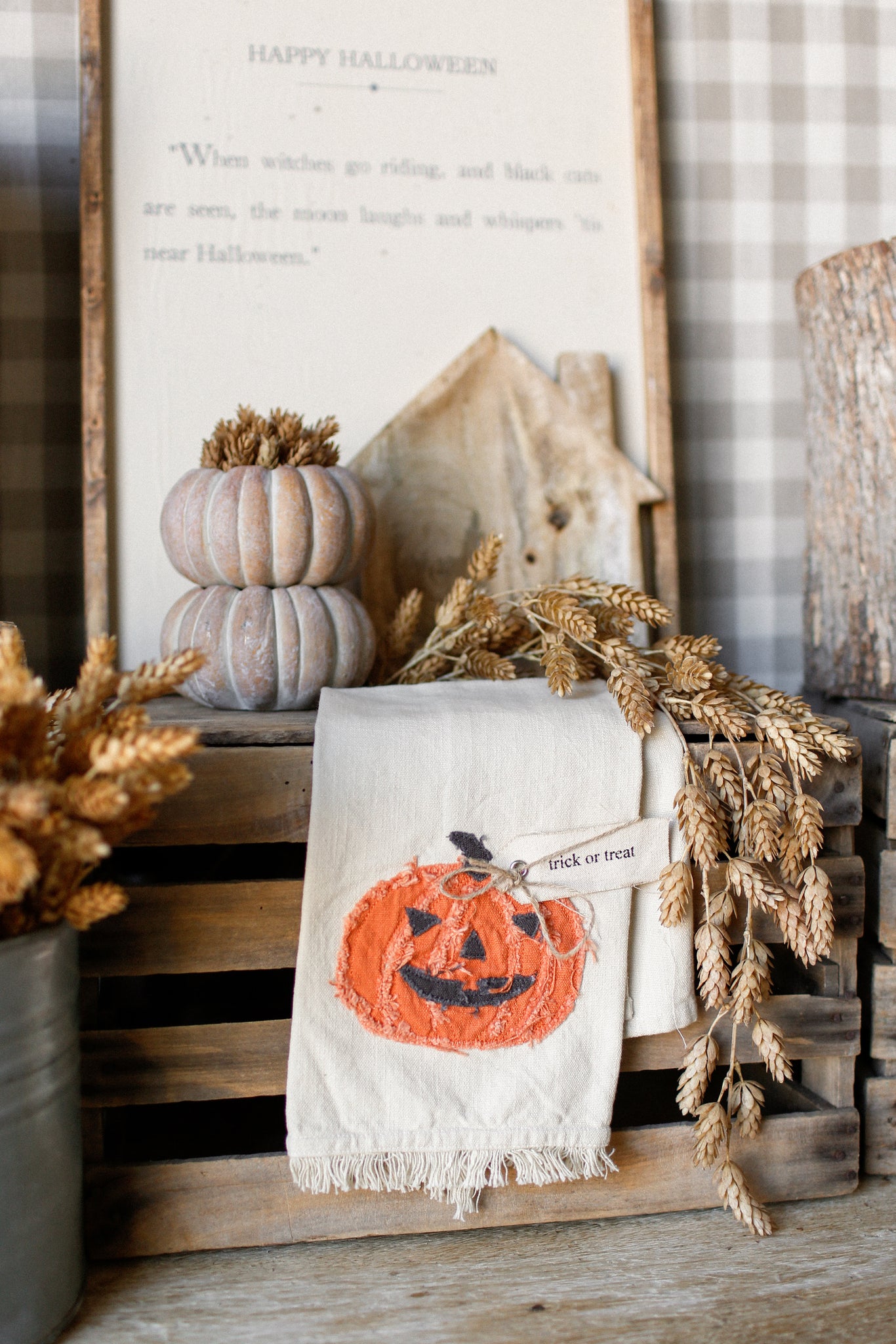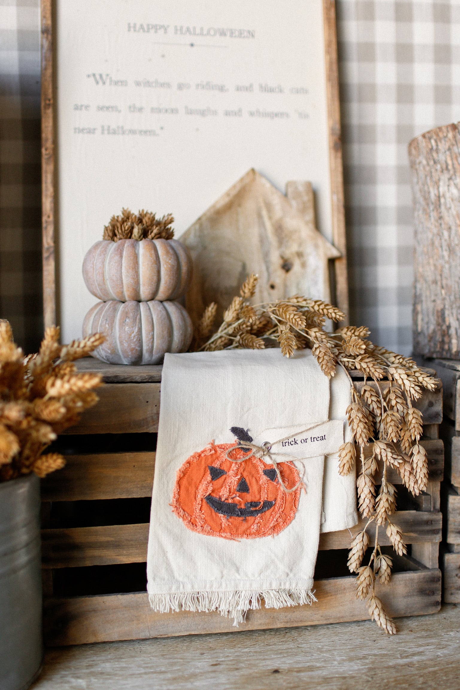 Add a touch of Halloween charm to your kitchen with the Raggedy Pumpkin Kitchen Towel. Featuring a playful jack-o'-lantern pumpkin design and a twine-tied tag that reads "trick or treat," this towel brings festive fun right to your kitchen. Its fringed bottom adds a cozy, rustic feel perfect for seasonal décor or everyday use during the spooky season.
